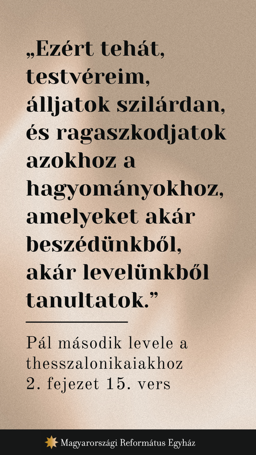 (15) „Ezért tehát, testvéreim, álljatok szilárdan, és ragaszkodjatok azokhoz a hagyományokhoz, amelyeket akár beszédünkből, akár levelünkből tanultatok.” (2Thessz 2,13–17)