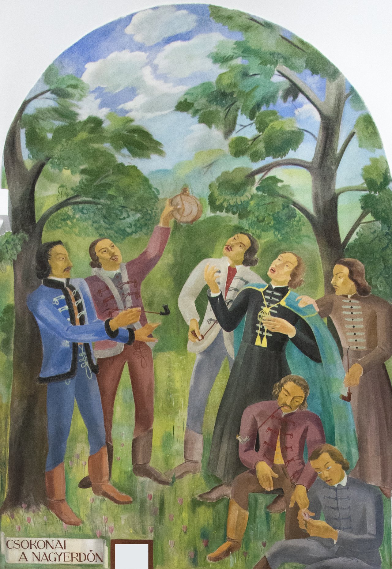 Értékeink nyomában járva, a Debreceni Református Kollégium Oratóriumához vezető lépcsőház második emeleti folyosóján találjuk Gáborjáni Szabó Kálmán Csokonai a Nagyerdőn című falfestményét, a Csokonai-szobában pedig Burai István által készített, Csokonai és diáktársai című festett üvegablakot. Az alkotásokat Csokonai Vitéz Mihály halálának évfordulója alkalmából ajánljuk, idézzük olvasóink emlékezetébe.