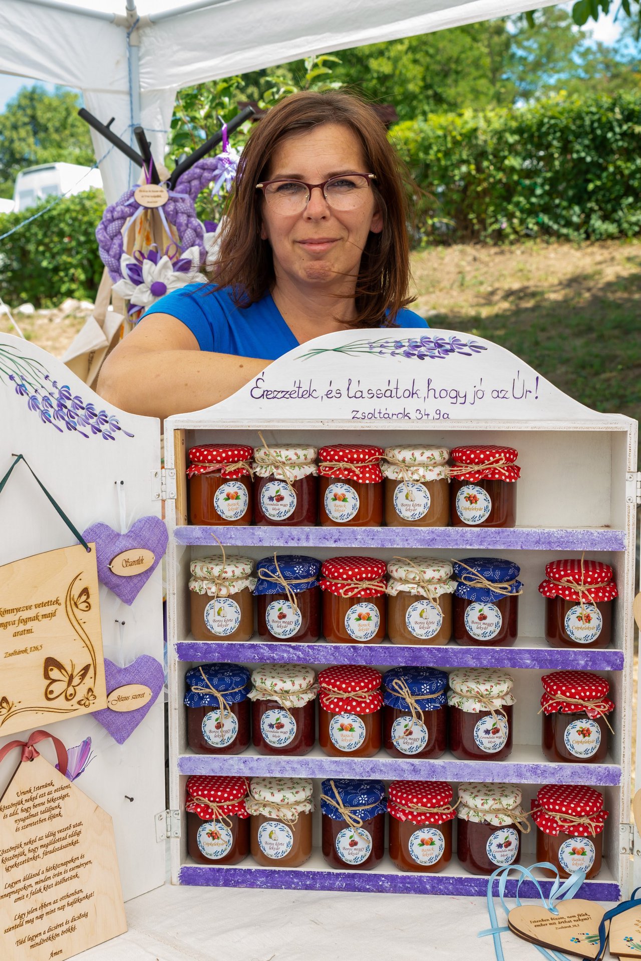 A missziós gondnok a kirakodóvásáron a Keresztyén Manufaktúra asztalánál megelégedve nyugtázza a forgalmat. – Gravírozott és kézzel festett ajándék- és használati tárgyakat: szalvétatartót, ceruzatartót, falra felakasztható szíveket, igés táblákat, textilbabákat árulunk. A Keresztyén Manufaktúra húszféle lekvárt készít évente a különféle savanyúságok mellett. Ehhez alapanyagul a parókiakertben megtermett gyümölcsöket, zöldségeket használjuk fel – magyarázza.