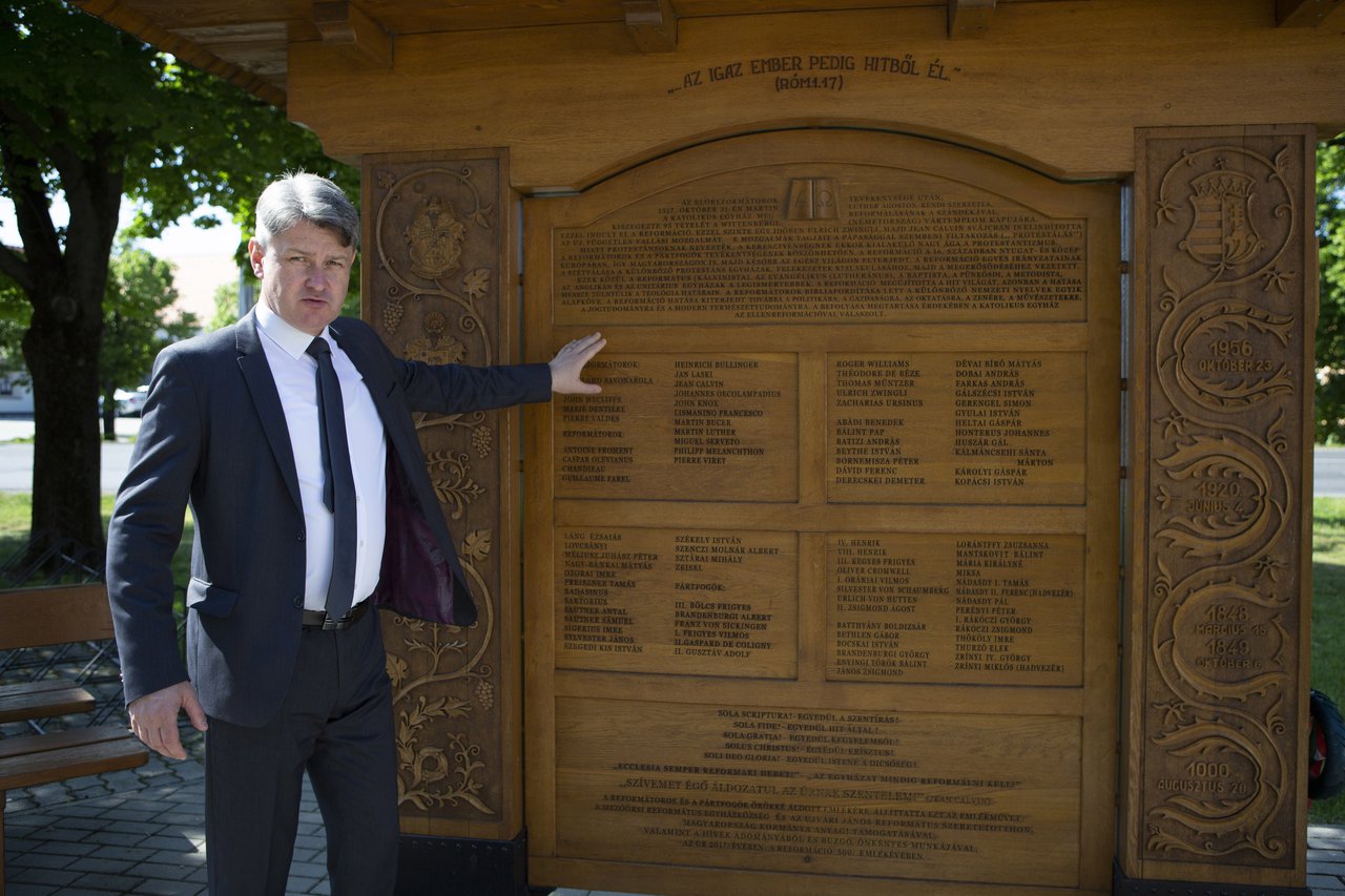 Szőke Barnabás lelkipásztor a reformáció 500. évfordulójára állított emléktábla előtt
