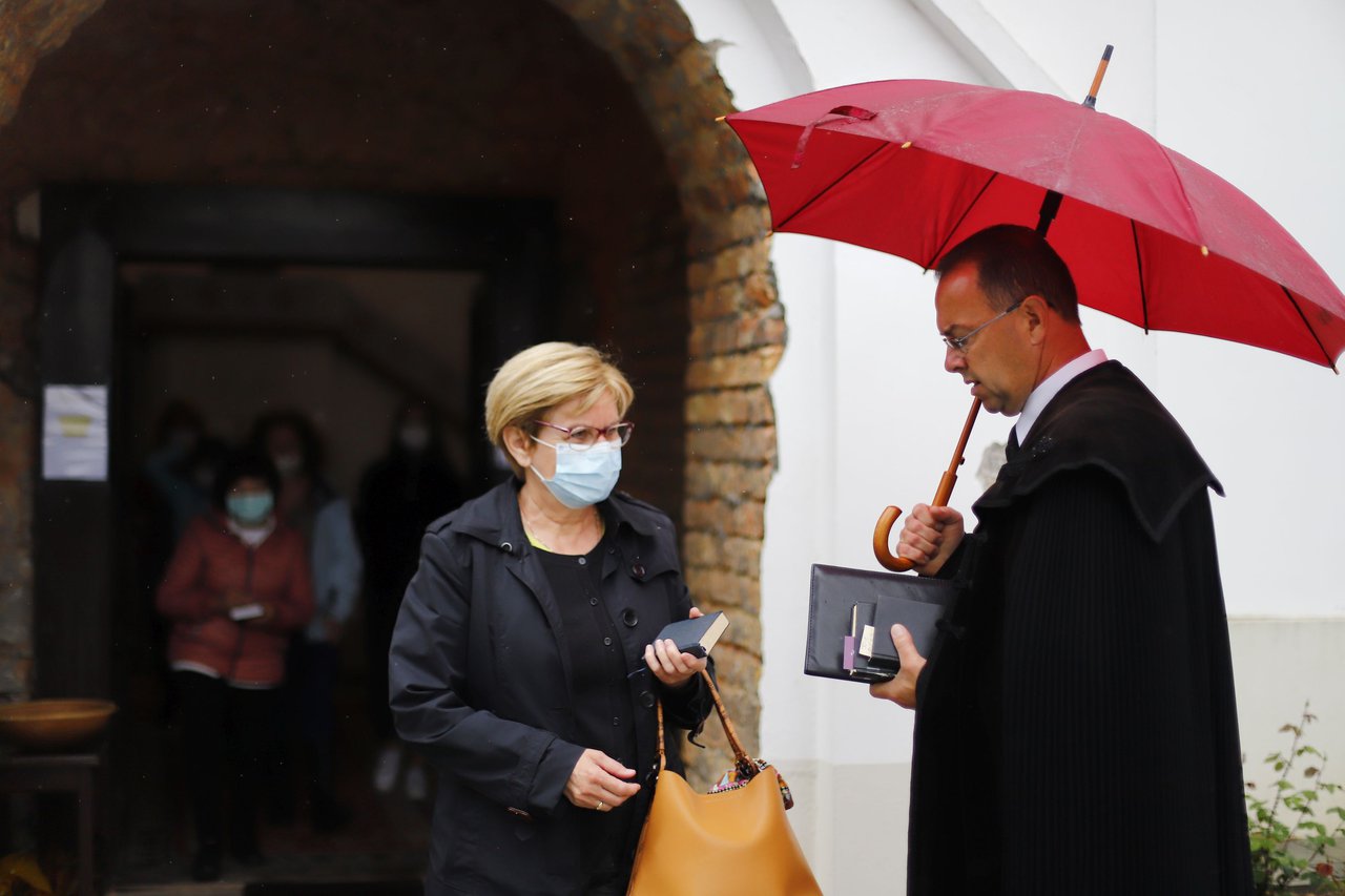 A templom tégláig bontott bejárata előtt Tósoki Csaba gondnok fogadja az érkezőket, és akinél nincs arcmaszk, tőle vehet el egyet. Figyelemreméltó, hogy alig egy-két gyülekezeti tag él ezzel a lehetőséggel, a többség hozza magával a saját védőeszközét. Akadnak olyanok is, akik saját készítésű maszkjaikat még ki is hímezték.