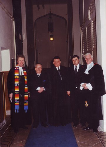 Rev. John Spierce, Convener of the World Mission Council; Dr József Schweitzer, Chief Rabbi; Rev. Tamás Bertalan, Minister of Scottish Mission; Rev. Dr Bölcsei Gusztáv; Presiding Bishop of RCH; and Very Rev. Alain Main, Moderator of the General Assembly of the Church of Scotland gather together in 2005 for Rev. Tamás Bertalan's last worship service in the Mission before his retirement.