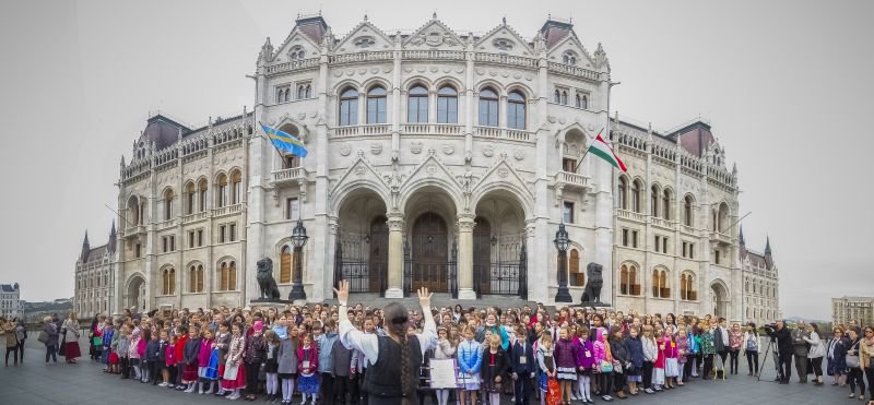 A Béres Ferenc Országos Református Éneklőverseny résztvevői az Országház előtt örvendeztették meg az arra járókat énekükkel 2019. április 5-én.