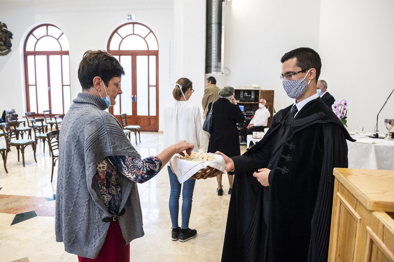 A képernyők előtt töltött húsvét után a pünkösdöt már, hála Istennek, gyülekezeti közösségben ünnepelhettük. Az úrvacsorai kenyeret és a bort a higiéniai szabályok betartásával osztották lelkészeink.