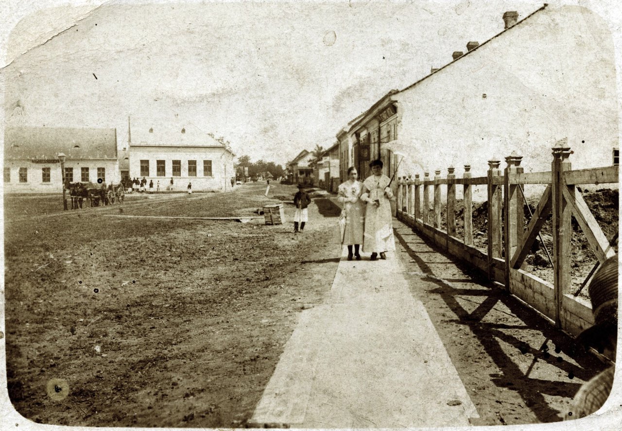 Első képünk Csengerben készült valamikor 1914 után. A fotón a háttérben bal oldalon látható a református iskola, amelyből gatyás parasztgyerekek jönnek ki éppen. Az előtérben két nő sétál, akik feltehetően módosabb zsidó asszonyok, esetleg anya és lánya.