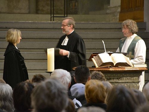 Ezt a közös istentiszteletet már több, mint egy évtizede rendszeresen megtartjuk, ugyanakkor lelkészeink lehetőséget kapnak arra, hogy Zürich emblematikus templomának szószékéről hirdethetik Isten igéjét. A német nyelven való prédikáció ugyanakkor komoly kihívást is jelent lelkészeink számára. Az istentisztelet liturgiáját ezúttal Christoph Sigrist, a Grossmünster lelkésze végezete. Ő az, aki kis magyar közösségünket bátran támogatta és támogatja ma is, amikor a zürichi egyházreform következtében elestünk a svájci anyagi támogatástól. Emiatt a döntés miatt újra kellett gondolnunk a magyar nyelvű lelkigondozás jövőjét is. Kókai Csaba eddigi lelkészünk szerződését sajnos nem tudtuk megújítani, így alkalmazott lelkész helyett a Svájcban élő magyar református, vagy evangélikus lelkészek helyettesítő szolgálatára vagyunk utalva. Isten gondoskodásának köszönhetjük, hogy az itt élő lelkészek elvállalták ezt a feladatot. Zürichben dr. Michna Krisztina református lelkipásztor vette át a magyar gyülekezeti munkát.
