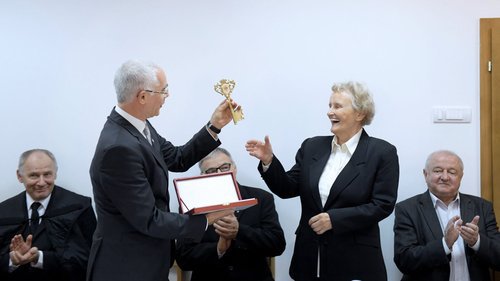 Balog Zoltán, az emberi erőforrások minisztere átadja az Apáczai Diákotthon új épületszárnyának kulcsát Nagy Margit igazgatónak.