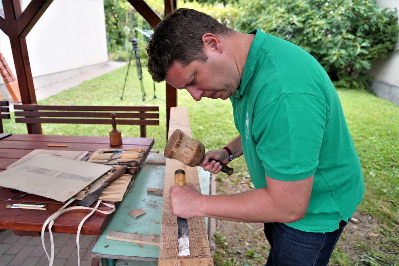 Az emlékoszlop egy váci családi ház kertjében készül. Juhász András, aki már évtizedek óta foglalkozik fafaragással, lelkesen magyarázza alkotásainak szimbólumrendszerét. – A nap az éltetőnk, kozmikus erő, mondják a hitetlenek, de nekünk ez maga az Úr. Éppen ezért szeretem valamilyen módon megjeleníteni az alkotásaimban – mondja. A kérdésre, hogy van-e műhelye a mesternek, az a válasz érkezik, hogy az egész ház tulajdonképpen egy műhely, a szabadban való munkát azonban nagyon szereti.
