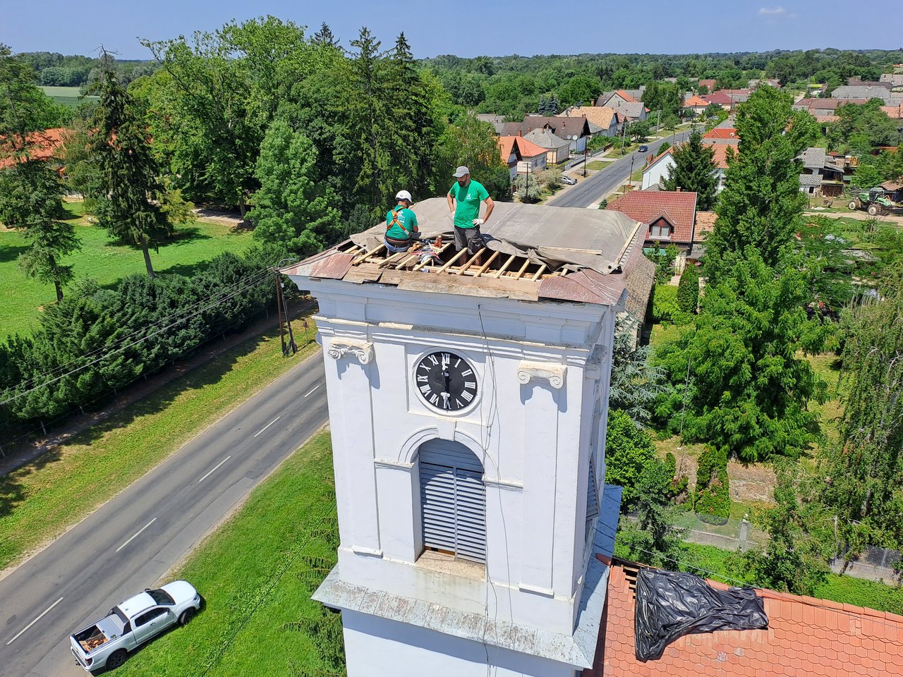 Újabb állagmegóvási munkákat végeztek a Magyar Református Szeretetszolgálat Kutató-Mentőcsoportjának tagjai tegnap, a május végén viharkárokat szenvedett csokonyavisontai református templomon. A tomboló vihar következtében kettétört a templomtorony, amelyet egy emelődaru segítségével múlt héten sikerült eltávolítani. Két hete a főrész cserepeit javították, tegnap pedig ideiglenes ponyvával látták el a templomtorony tetejét, hogy megóvják az épületet a beázástól addig, amíg az új süveg elkészül – mondta el Hegedűs Gábor, a Kutató-Mentőcsoport vezetője. Harminchét méter magasságban kellett dolgozni. Le is mérték a templomtornyot széltében-hosszában a javítást tervező mérnök számára. Egy új templomsüveg persze nem olcsó, és hónapokban mérhető, mire felkerül majd a végleges fedés. Hegedűs Gábor abba is beavatott minket, hogy a mentőcsapat többször segédkezett már viharkárok javításánál, készítettek hátrányos helyzetű család házára ideiglenes tetőszerkezetet egy tűzeset után, vagy épp egy december 24-én leégett hetedik emeleti lakásra raktak fel ideiglenes nyílászárókat. Egyházi ingatlanon most először dolgoztak.