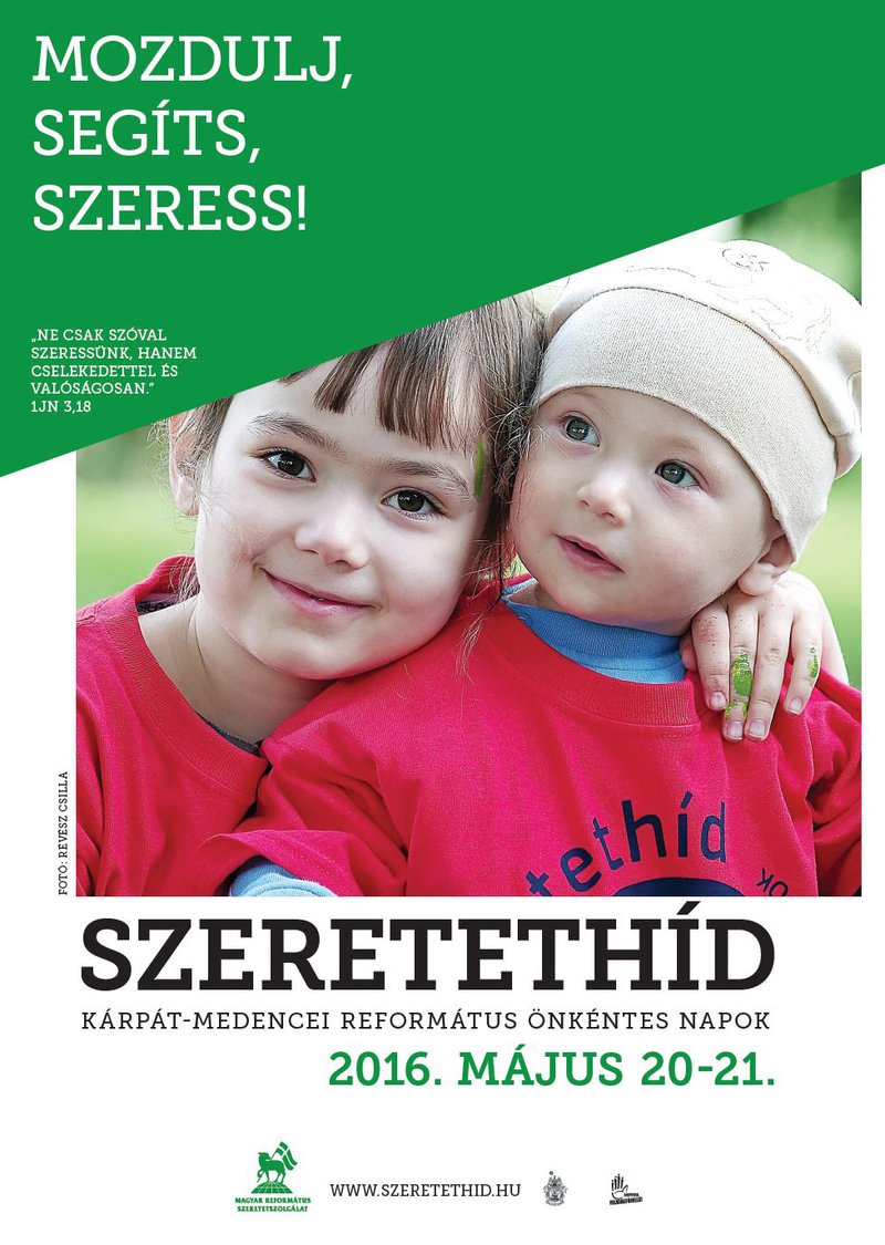 A Szeretethíd elnevezésű önkéntes napokat 2009-ben hívta életre a Magyar Református Szeretetszolgálat azzal a céllal, hogy időseket és fiatalokat egyaránt bátorítson: közösen tegyenek egymásért, a helyi és gyülekezeti közösségeikért és a teremtett világért. Hídépítő munkájukhoz idén is csatlakozhatunk: Kárpát-medence szerte a május 20-21-i hétvégén zajlanak majd a legkülönfélébb önkéntes megmozdulások. Részletek a szeretethid.hu oldalon.